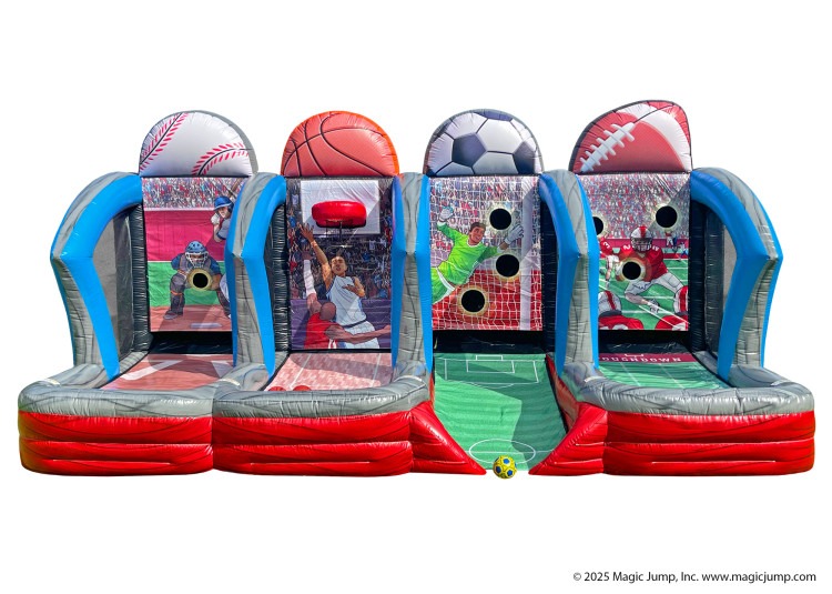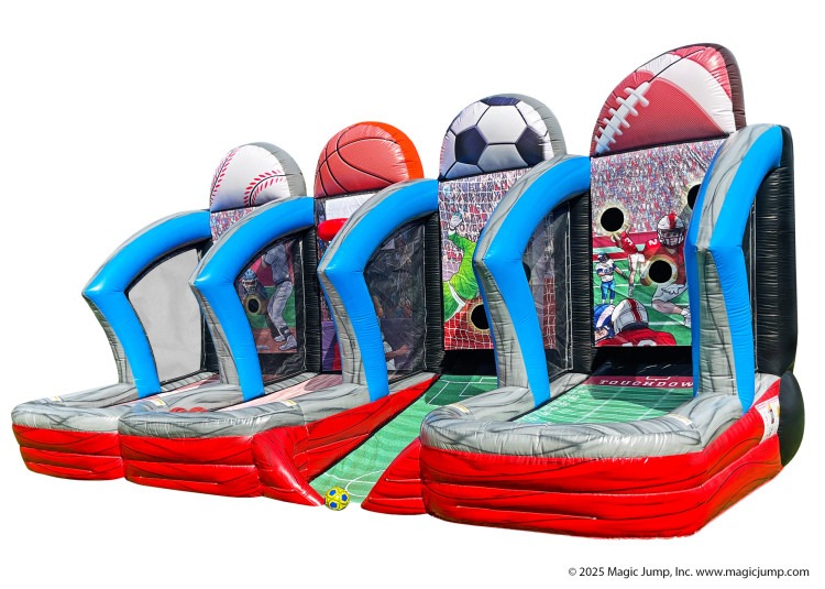 Throw a strike! Throw for a touchdown! Shoot a goal past the keeper! Aim for a basket! Sports Shootout gives participants the opportunity to test their skills at each of these challenges. This is an attractive sports inflatable that is sure to stand out anywhere. The arching pillars and enclosing nets separate each lane while a baseball, inflatable football, basketball and soccer ball stands atop identifying each lane. Those who take on the Sports Shootout are sure to enjoy hours of challenging fun.